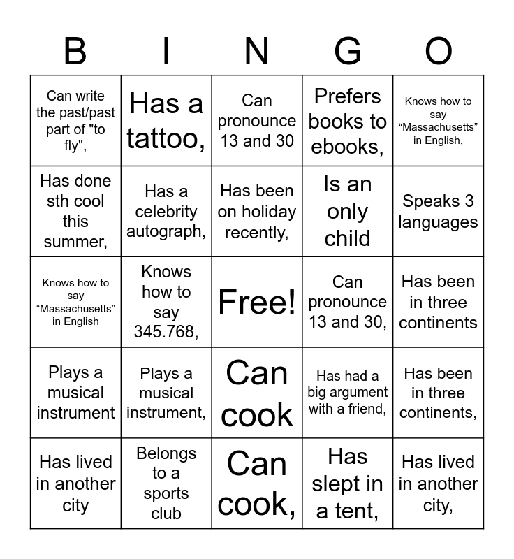 This bingo card has a free space and 48 words: Is an only child,Was born in another country,Speaks 3 languages,, Has lived in another city,, Can sing a song in English,, Can cook,, Plays a musical instrument,, Has a sports trophy,, Has a tattoo,, Has a dog,, Has done sth cool this summer,, Belongs to a sports club,, Has a celebrity autograph,, Prefers books to ebooks,, Has been in three continents,, Has had a big argument with a friend,, Doesn’t like English,, Can tell a joke in English,, Has been on holiday recently,, Can pronounce 13 and 30,, Knows how to pronounce "bear" and "beer",, Knows how to say “Massachusetts” in English,, Knows how to say 345.768,, Has slept in a tent,, Can write the past/past part of "to fly",, Is an only child, Was born in another country, Speaks 3 languages, Has lived in another city, Can sing a song in English, Can cook, Plays a musical instrument, Has a sports trophy, Has a tattoo, Has a dog, Has done sth cool this summer, Belongs to a sports club, Has a celebrity autograph, Prefers books to ebooks, Has been in three continents, Has had a big argument with a friend, Doesn’t like English, Can tell a joke in English, Has been on holiday recently, Can pronounce 13 and 30, Knows how to pronounce "bear" and "beer", Knows how to say “Massachusetts” in English, Knows how to say 345.768, Has slept in a tent and Can write the past simple of "to fly".