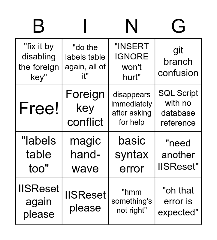 This bingo card has 16 words: IISReset please, "need another IISReset", "INSERT IGNORE won't hurt", "fix it by disabling the foreign key", "labels table too", "do the labels table again, all of it", basic syntax error, "hmm something's not right", Free!, Foreign key conflict, IISReset again please, git branch confusion, magic hand-wave, SQL Script with no database reference, disappears immediately after asking for help and "oh that error is expected".