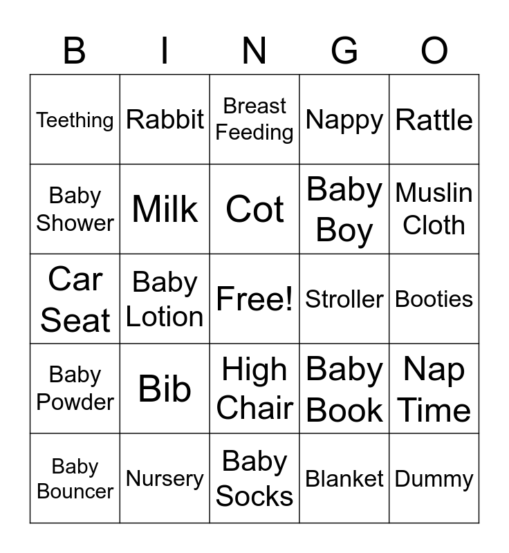 This bingo card has a free space and 40 words: Bottle, Car Seat, Ultra-Sound, Milk, Nursery, High Chair, Cot, Toys, Rattle, Baby Powder, Baby Lotion, Nappy, Dummy, Booties, Stroller, Bib, Spit Up, Teething, Formula, Breast Feeding, Nap Time, Blanket, Baby Boy, Baby Shower, Mommy, Daddy, Crying, Labour, Twins, Due Date, Poo, Baby Bouncer, Baby Grow, Baby Book, Muslin Cloth, Baby Socks, Hooded Towel, Blue, Rabbit and Baby Bump.