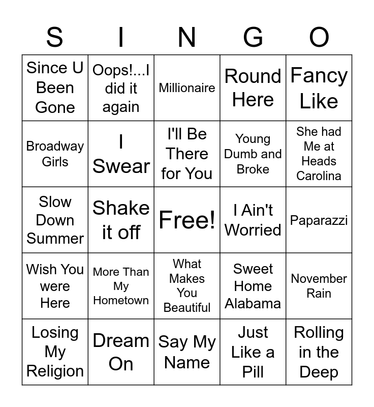 This bingo card has a free space and 24 words: More Than My Hometown, Dream On, I'll Be There for You, Losing My Religion, Fancy Like, Since U Been Gone, Broadway Girls, Oops!...I did it again, I Ain't Worried, What Makes You Beautiful, Young Dumb and Broke, Slow Down Summer, Sweet Home Alabama, November Rain, I Swear, Just Like a Pill, Paparazzi, Millionaire, She had Me at Heads Carolina, Shake it off, Rolling in the Deep, Wish You were Here, Round Here and Say My Name.