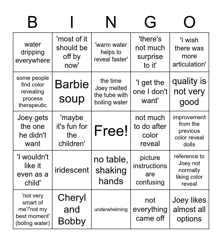 This bingo card has a free space and 24 words: iridescent, Cheryl and Bobby, the time Joey melted the tube with boiling water, 'not very smart of me'/'not my best moment' (boling water), 'I wish there was more articulation', water dripping everywhere, some people find color revealing process therapeutic, 'most of it should be off by now', not much to do after color reveal, no table, shaking hands, 'I get the one I don't want', Joey gets the one he didn't want, picture instructions are confusing, reference to Joey not normally liking color reveal, Barbie soup, not everything came off, improvement from the previous color reveal dolls, 'warm water helps to reveal faster', quality is not very good, 'maybe it's fun for the children', Joey likes almost all options, 'I wouldn't like it even as a child', 'there's not much surprise to it' and underwhelming.