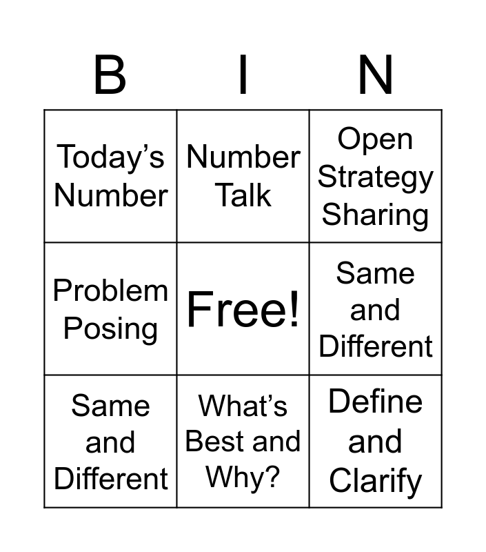 This bingo card has a free space and 8 words: Same and Different, Open Strategy Sharing, Number Talk, Same and Different, Today’s Number, Define and Clarify, Problem Posing and What’s Best and Why?.