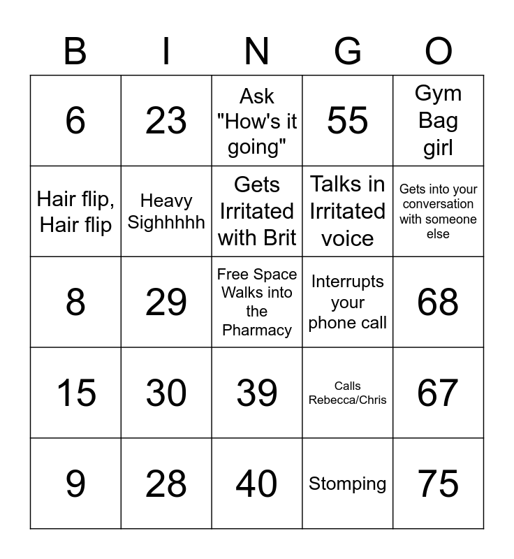 This bingo card has a free space and 75 words: Leaves cap off of pen, Messy work area, Ask "How's it going", Says "Struggle Bus", Says "So special", Ponytail Girl, Doesn't push in chair, Prints script from epic, Stomping, Says "So irritating", Micromanages a problem you are working on, Babying Patient/Parent, Interrupts your phone call, Gets into your conversation with someone else, Gets Coke Zero, Heavy Sighhhhh, Says "It's fine i'll do it", Calls Rebecca/Chris, Stumbles with a counsel, Hair flip, Hair flip, Shoes are untied, Gets Irritated with Brit, Talks in Irritated voice, Gym Bag girl, 6, 21, 35, 51, 66, 7, 22, 36, 52, 67, 8, 23, 37, 53, 68, 9, 24, 38, 54, 69, 10, 25, 39, 55, 70, 11, 26, 40, 56, 71, 12, 27, 41, 57, 72, 13, 28, 42, 58, 73, 14, 29, 43, 59, 74, 15, 30, 44, 60, 75 and 45.