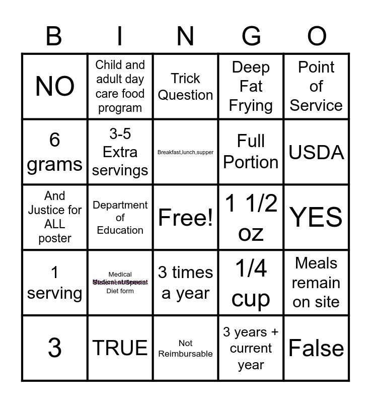 This bingo card has 1 images, a free space and 24 words: Medical Statement/Special Diet form, TRUE, Breakfast,lunch,supper, 3, Point of Service, NO, 6 grams, Child and adult day care food program, 1 1/2 oz, 3 times a year, Full Portion, And Justice for ALL poster, 1/4 cup, Meals remain on site, 3-5 Extra servings, 3 years + current year, YES, Trick Question, USDA, Department of Education, False, 1 serving, Deep Fat Frying and Not Reimbursable.
