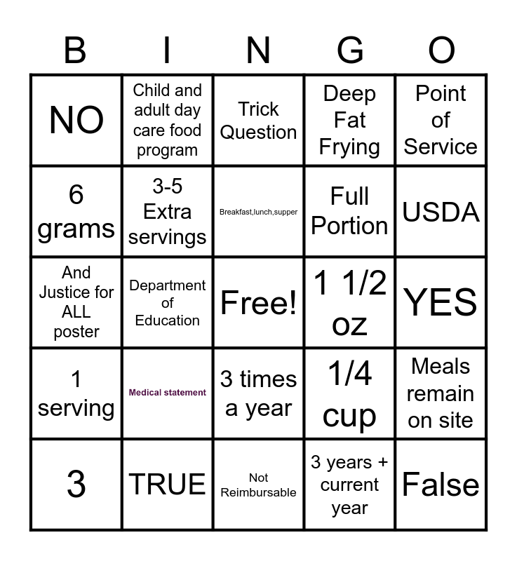 This bingo card has 1 images, a free space and 23 words: TRUE, Breakfast,lunch,supper, 3, Point of Service, NO, 6 grams, Child and adult day care food program, 1 1/2 oz, 3 times a year, Full Portion, And Justice for ALL poster, 1/4 cup, Meals remain on site, 3-5 Extra servings, 3 years + current year, YES, Trick Question, USDA, Department of Education, False, 1 serving, Deep Fat Frying and Not Reimbursable.