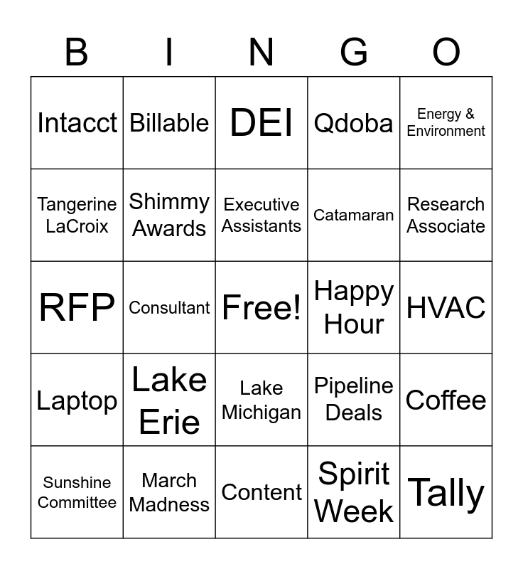 This bingo card has a free space and 59 words: MarComm, March Madness, Open Enrollment, Laptop, Spirit Week, Employee Appreciation Day, Shimmy Awards, Cowbell, Catamaran, Production, Qdoba, Health, Tangerine LaCroix, Accounting, Timesheet, Intacct, Tally, Energy & Environment, Talent & Economics, Executive Assistants, Happy Hour, DEI, Sunshine Committee, Coffee, Michigan Saves, Budget, Sector, Public, Research Associate, Proposal, Monday.com, Berry LaCroix, Lake Ontario, Client, Billable, Wellness Committee, Lemon LaCroix, Consultant, Report, RFP, Sales, Lake Erie, HVAC, Parking, Basement Salad, Big Room, Lake Huron, Soup-a-palooza, Lake Michigan, Content, Director, GLFT, Professional Development, President, Lake Superior, Pipeline Deals, Playbook, Calendar and Lobby.