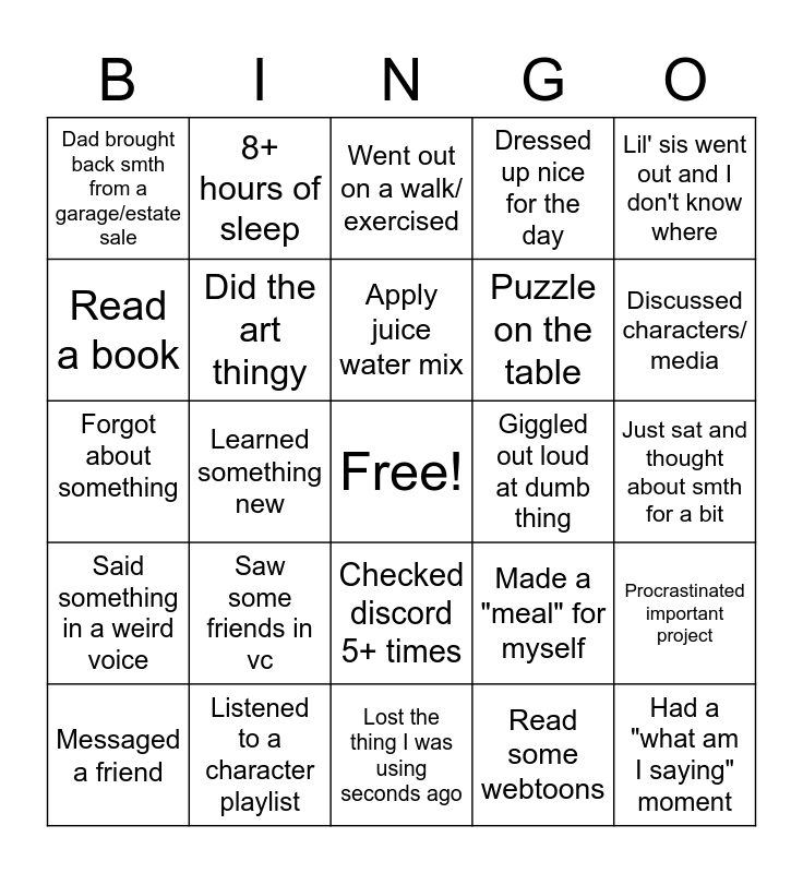 This bingo card has a free space and 24 words: Saw some friends in vc, Listened to a character playlist, Apply juice water mix, Messaged a friend, Lil' sis went out and I don't know where, Dad brought back smth from a garage/estate sale, Read a book, 8+ hours of sleep, Giggled out loud at dumb thing, Checked discord 5+ times, Puzzle on the table, Forgot about something, Made a "meal" for myself, Procrastinated important project, Did the art thingy, Read some webtoons, Just sat and thought about smth for a bit, Went out on a walk/ exercised, Discussed characters/ media, Learned something new, Had a "what am I saying" moment, Said something in a weird voice, Dressed up nice for the day and Lost the thing I was using seconds ago.