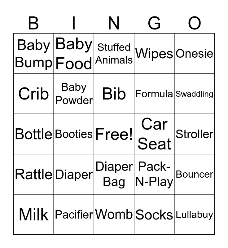 This bingo card has a free space and 24 words: Diaper, Pacifier, Bib, Milk, Onesie, Baby Bump, Crib, Baby Food, Car Seat, Diaper Bag, Formula, Bottle, Pack-N-Play, Bouncer, Baby Powder, Socks, Stroller, Stuffed Animals, Swaddling, Booties, Lullabuy, Rattle, Wipes and Womb.