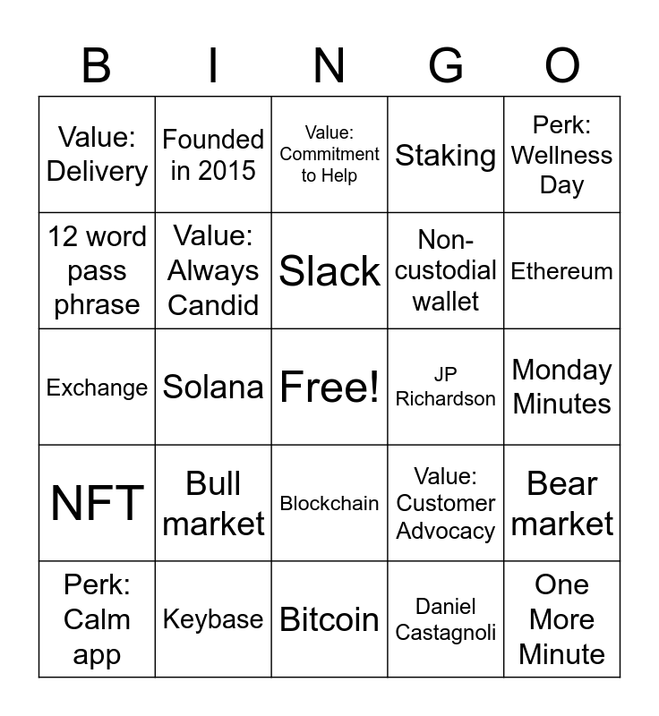 This bingo card has a free space and 31 words: Bitcoin, Cryptocurrency, Solana, Cardano, Value: Delivery, Value: Commitment to Help, Value: Always Candid, Value: Customer Advocacy, JP Richardson, Daniel Castagnoli, Monday Minutes, One More Minute, All Hands Meeting, ALGO, Ethereum, Fiat, Bear market, Bull market, NFT, Blockchain, Perk: Wellness Day, Perk: Swag store, Perk: Calm app, Founded in 2015, Non-custodial wallet, 12 word pass phrase, Staking, Exchange, Keybase, Slack and Grafana.