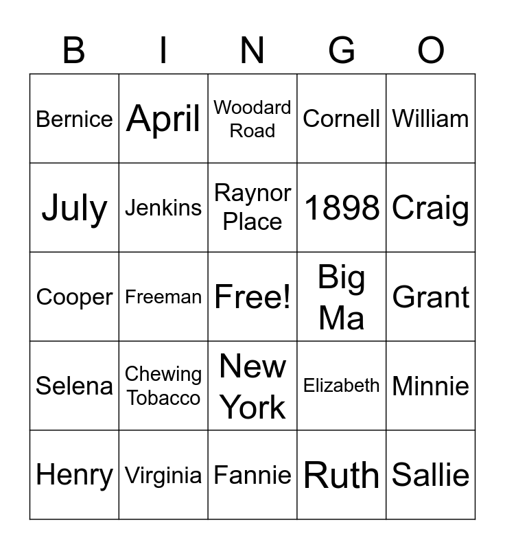 This bingo card has a free space and 34 words: Willie Mae, Ruth, Lock, Lonnie, Selena, Jenkins, William, Henry, April, Cedar Landing, Raynor Place, Woodard Road, Peterson Grove, St. Paul, Big Ma, Craig, Virginia, Cooper, Chewing Tobacco, Elizabeth, New York, 8, Bernice, Grant, Fannie, Sallie, Cornell, 1900, 1898, July, Just Keep Living, Freeman, Minnie and Apple Butter.