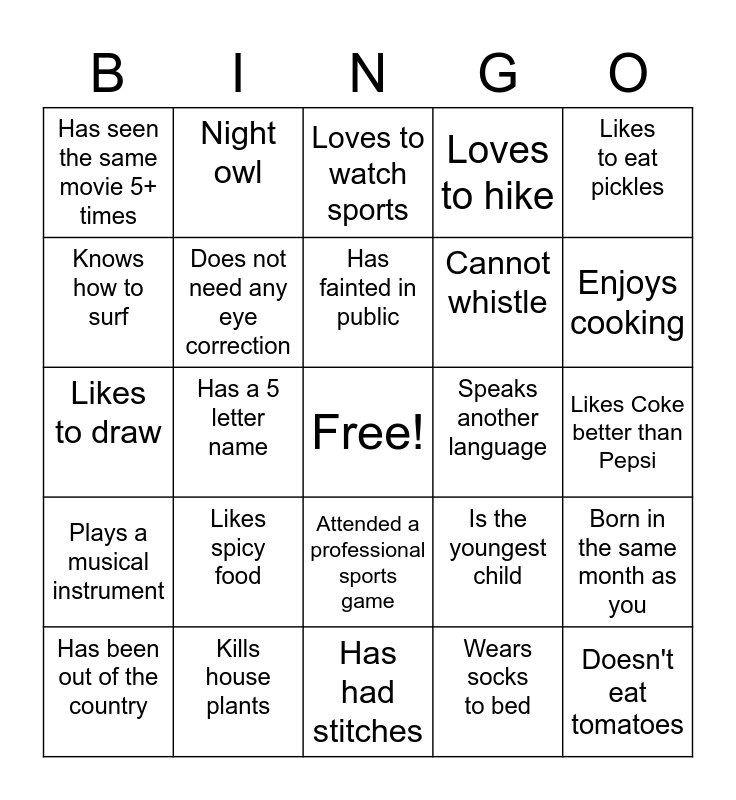 This bingo card has a free space and 24 words: Likes spicy food, Kills house plants, Has fainted in public, Has been out of the country, Likes to eat pickles, Has seen the same movie 5+ times, Knows how to surf, Night owl, Speaks another language, Attended a professional sports game, Cannot whistle, Likes to draw, Is the youngest child, Born in the same month as you, Does not need any eye correction, Wears socks to bed, Likes Coke better than Pepsi, Loves to watch sports, Enjoys cooking, Has a 5 letter name, Doesn't eat tomatoes, Plays a musical instrument, Loves to hike and Has had stitches.