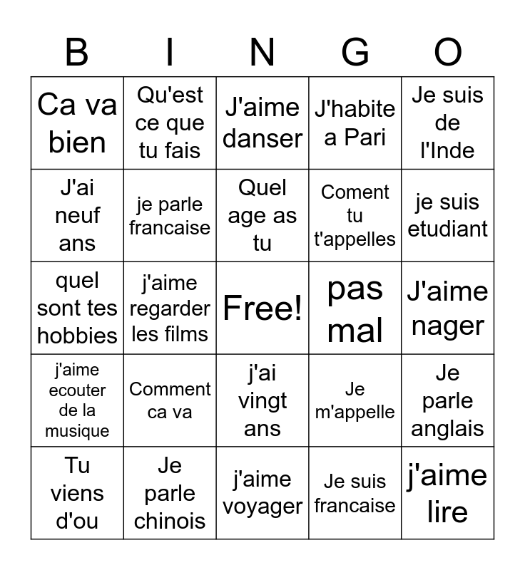 This bingo card has a free space and 24 words: Comment ca va, Je parle chinois, Quel age as tu, Tu viens d'ou, Je suis de l'Inde, Ca va bien, J'ai neuf ans, Qu'est ce que tu fais, pas mal, j'ai vingt ans, Coment tu t'appelles, quel sont tes hobbies, Je m'appelle, Je parle anglais, je parle francaise, Je suis francaise, J'aime nager, J'aime danser, je suis etudiant, j'aime regarder les films, j'aime lire, j'aime ecouter de la musique, J'habite a Pari and j'aime voyager.