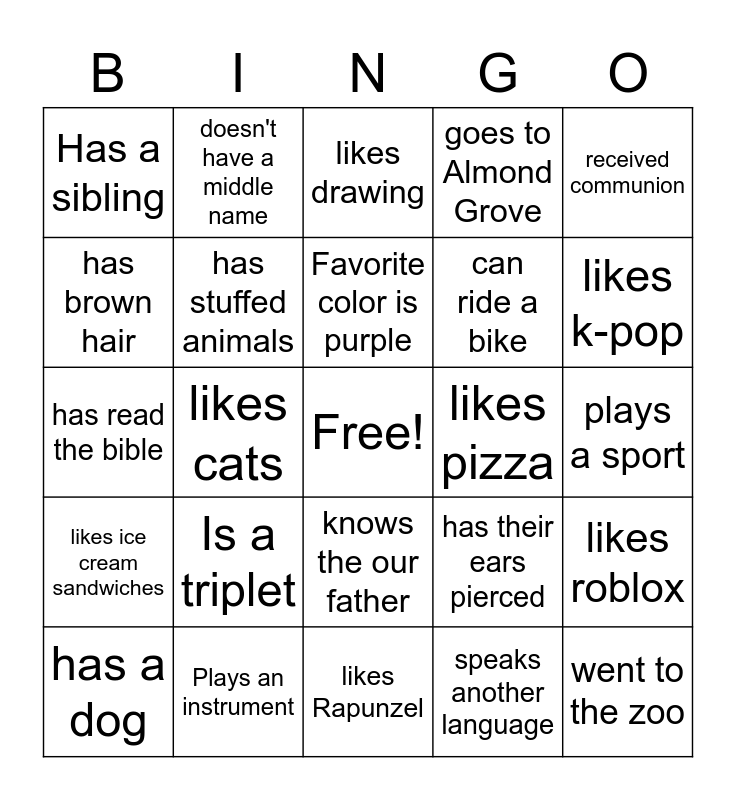 This bingo card has a free space and 24 words: Is a triplet, Plays an instrument, Favorite color is purple, has a dog, received communion, Has a sibling, has brown hair, doesn't have a middle name, likes pizza, knows the our father, can ride a bike, has read the bible, has their ears pierced, likes roblox, has stuffed animals, speaks another language, plays a sport, likes drawing, likes k-pop, likes cats, went to the zoo, likes ice cream sandwiches, goes to Almond Grove and likes Rapunzel.