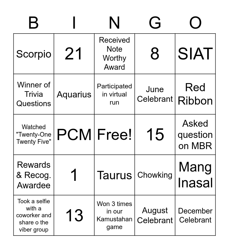 This bingo card has a free space and 25 words: 1, Won 3 times in our Kamustahan game, Participated in virtual run, Took a selfie with a coworker and share o the viber group, SIAT, Scorpio, Winner of Trivia Questions, 21, 15, Taurus, June Celebrant, Watched "Twenty-One Twenty Five", Chowking, Mang Inasal, Aquarius, Joined SCF Teaming Session, Asked question on MBR, Received Note Worthy Award, Red Ribbon, PCM, December Celebrant, 13, Rewards & Recog. Awardee, 8 and August Celebrant.