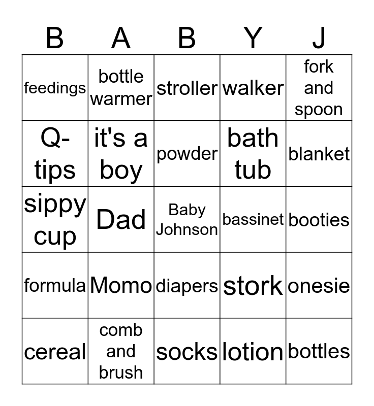 This bingo card has a free space and 24 words: Momo, comb and brush, powder, cereal, fork and spoon, feedings, Q-tips, bottle warmer, bassinet, diapers, bath tub, sippy cup, stork, onesie, it's a boy, lotion, booties, stroller, blanket, Dad, bottles, formula, walker and socks.