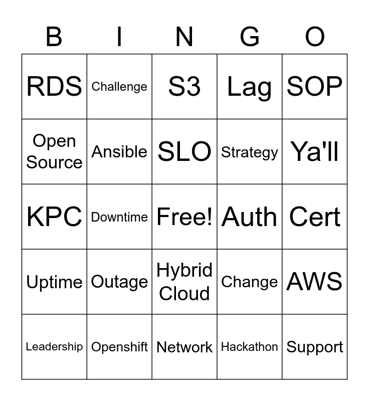 This bingo card has a free space and 41 words: RHC, KPC, ROI, Ansible, Openshift, Hybrid Cloud, SLO, SLI, SOP, Uptime, Downtime, Lag, Support, Cert, Auth, Outage, RCA, RDS, Kafka, S3, AWS, Traffic, Network, Strategy, Slack, CoreOS, Hackathon, Consoledot, Ya'll, Development, Software, Challenge, Leadership, ReOrg, Change, Open Source, Global, Managed Services, Customers, Cross Team and Collaboration.