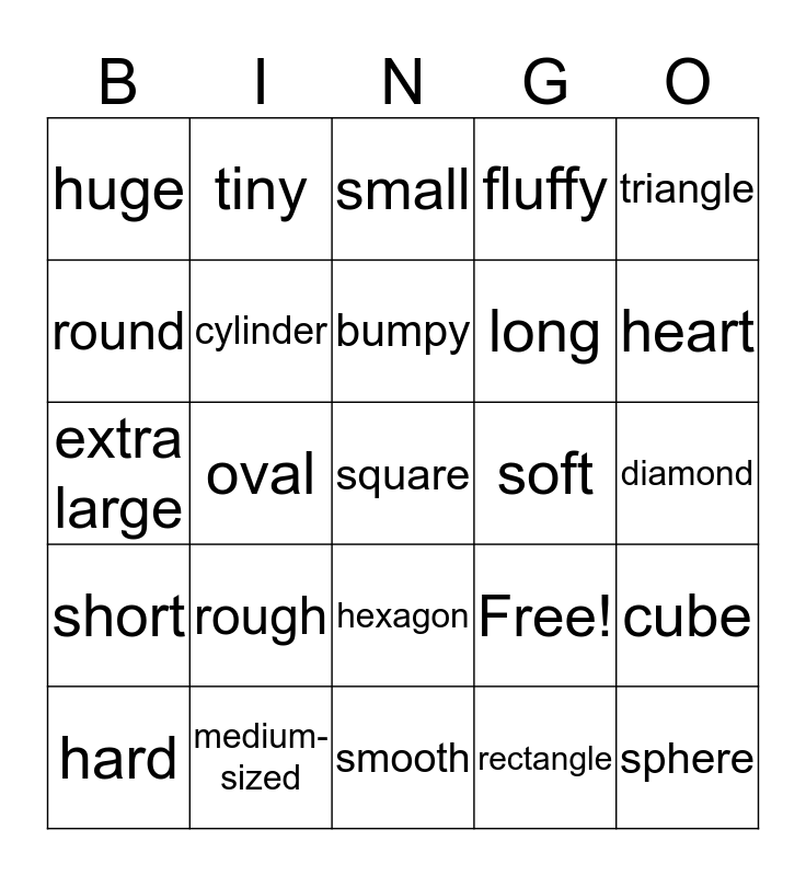 This bingo card has 25 words: rough, smooth, bumpy, hard, triangle, huge, round, tiny, soft, hexagon, long, extra large, Free!, cube, cylinder, sphere, diamond, small, heart, oval, square, medium-sized, short, fluffy and rectangle.