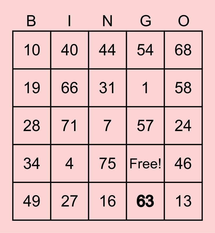 This bingo card has 25 words: 4, 16, 31, 49, 68, 10, 19, 40, 57, 75, 1, 28, Free!, 46, 66, 13, 24, 44, 58, 71, 7, 27, 34, 54 and 63.