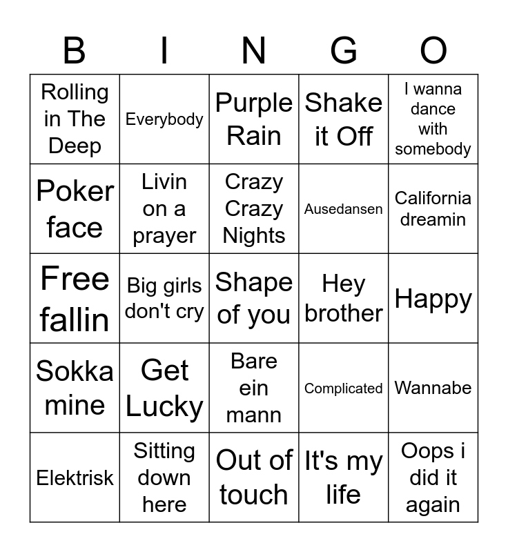 This bingo card has 79 words: Single Ladies, Hips Don't Lie, Purple Rain, Don't Stop me now, Take on me, Kongen på Havet, Sjørøverne kommer, Summer of 69, Come on Eileen, Everywhere, Despacito, Breaking Free, Shake it Off, Rolling in The Deep, Call me maybe, Poker face, Superbass, Get Lucky, Titanium, Happy, Gangnam Style, I wanna dance with somebody, Free fallin, Crazy Crazy Nights, Livin on a prayer, Better be good to me, Jovial, Sommerkroppen, With or without you, Africa, California dreamin, Hey Jude, Out of touch, Oops i did it again, Elektrisk, Hey brother, Barbie Girl, I want it that way, I know im not the only one, Shape of you, Smells like teen spirit, This Love, Thousand Miles, 500 Miles, Here comes the Sun, Everybody, Grace Kelly, Fairytale, E-ore, My heart will go on, Wannabe, Big girls don't cry, Complicated, Feel good, Tik Tok, Party in the USA, Idyll, En smak av honning, Tir n'a Noir, Bare ein mann, Ausedansen, Optimist, 99 Luftballons, Rompa Mi, Lys og varme, Splitter Pine, Voi Voi, Tore Tang, Bysommer, Sokka mine, Sitting down here, Grevling i taket, Billie Jean, (I've Had) The Time Of My Life, Total Eclipse of the Heart, It's my life, Dancing Queen, Mamma Mia and Dynamite.