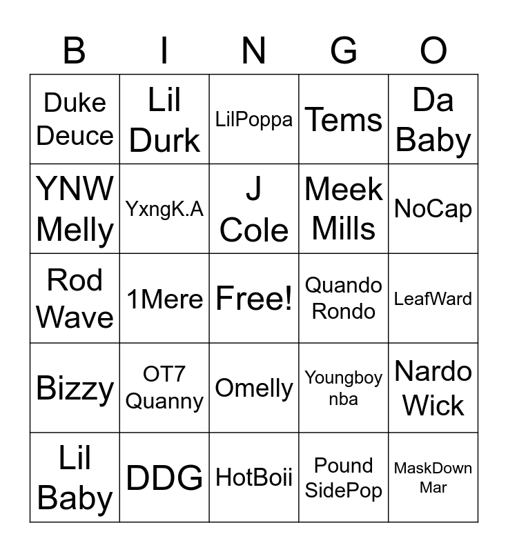 This bingo card has a free space and 24 words: OT7 Quanny, DDG, J Cole, Lil Baby, Da Baby, Duke Deuce, YNW Melly, Lil Durk, Quando Rondo, Omelly, Meek Mills, Rod Wave, Youngboy nba, Nardo Wick, YxngK.A, Pound SidePop, LeafWard, LilPoppa, NoCap, 1Mere, MaskDown Mar, Bizzy, Tems and HotBoii.