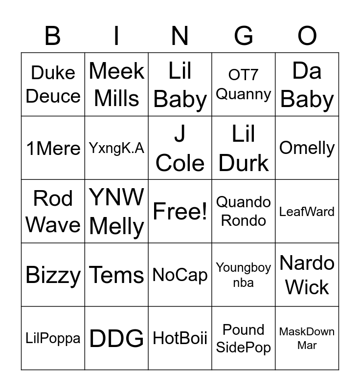 This bingo card has a free space and 24 words: Tems, DDG, J Cole, LilPoppa, Da Baby, Duke Deuce, 1Mere, Meek Mills, Quando Rondo, NoCap, Lil Durk, Rod Wave, Youngboy nba, Nardo Wick, YxngK.A, Pound SidePop, LeafWard, Lil Baby, Omelly, YNW Melly, MaskDown Mar, Bizzy, OT7 Quanny and HotBoii.