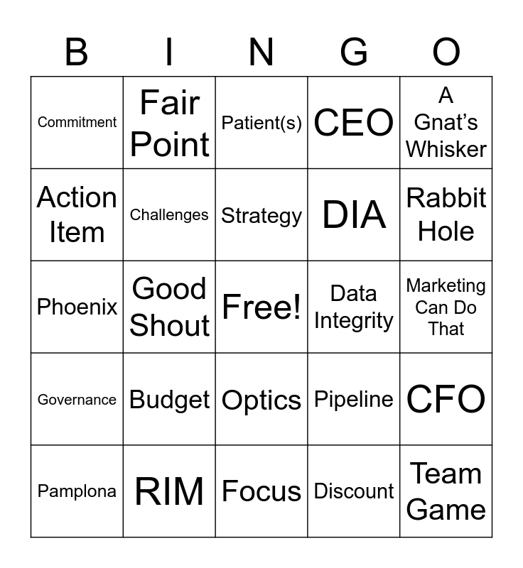This bingo card has a free space and 46 words: Critical Mass, Team Game, Forecast, Focus, Budget, Pricing, Fair Point, CRO Channel, Action Item, Return to Green, Challenges, CEO, CFO, Pipeline, SFDC, Target Operating Model, Strategy, Data Integrity, Tickety Boo, A Gnat’s Whisker, Good Shout, Discount, Commitment, DIA, Clean Data, Rabbit Hole, Pamplona, Tech Services, Optics, Governance, Therapeutic Area, Devil’s Advocate, Backlog, Scores on the Doors, Next Steps, RIM, Marketing Can Do That, Log/Raise a Ticket, P&C, SC, First Half, Patient(s), Phoenix, Medical Imaging, IRT and Azure.