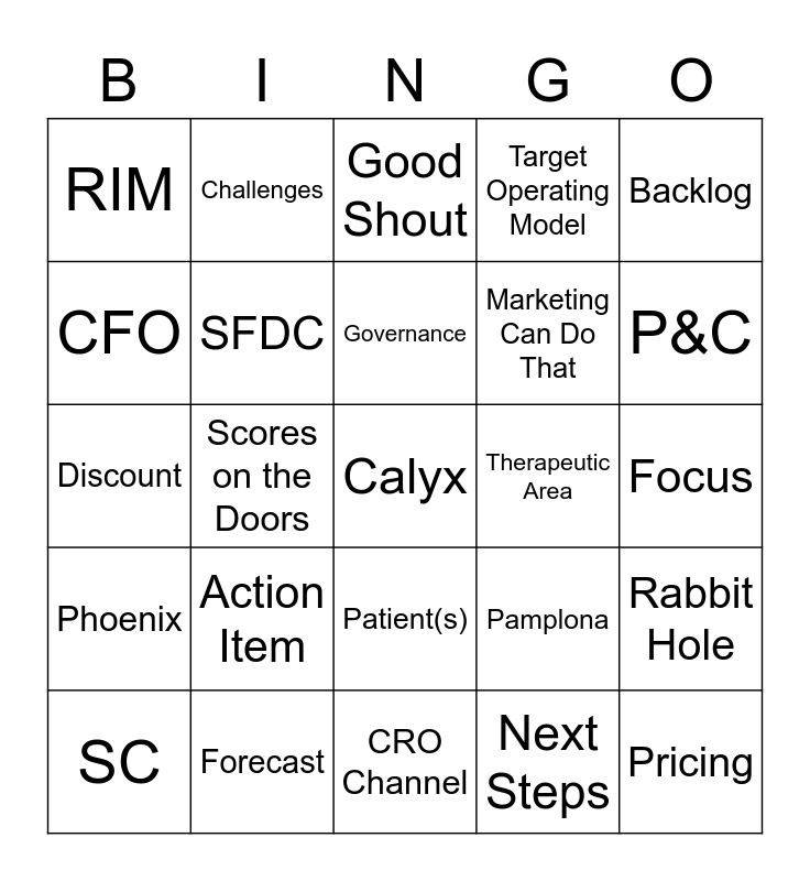This bingo card has a free space and 46 words: Budget, Pricing, Fair Point, CRO Channel, Action Item, Return to Green, Challenges, CEO, CFO, Pipeline, SFDC, Target Operating Model, Rabbit Hole, Pamplona, Tech Services, Optics, Governance, Therapeutic Area, Devil’s Advocate, Backlog, Scores on the Doors, Next Steps, RIM, Marketing Can Do That, Log/Raise a Ticket, P&C, SC, First Half, Patient(s), Phoenix, Medical Imaging, IRT, Azure, Critical Mass, Team Game, Forecast, Focus, Strategy, Data Integrity, Tickety Boo, A Gnat’s Whisker, Good Shout, Discount, Commitment, DIA and Clean Data.