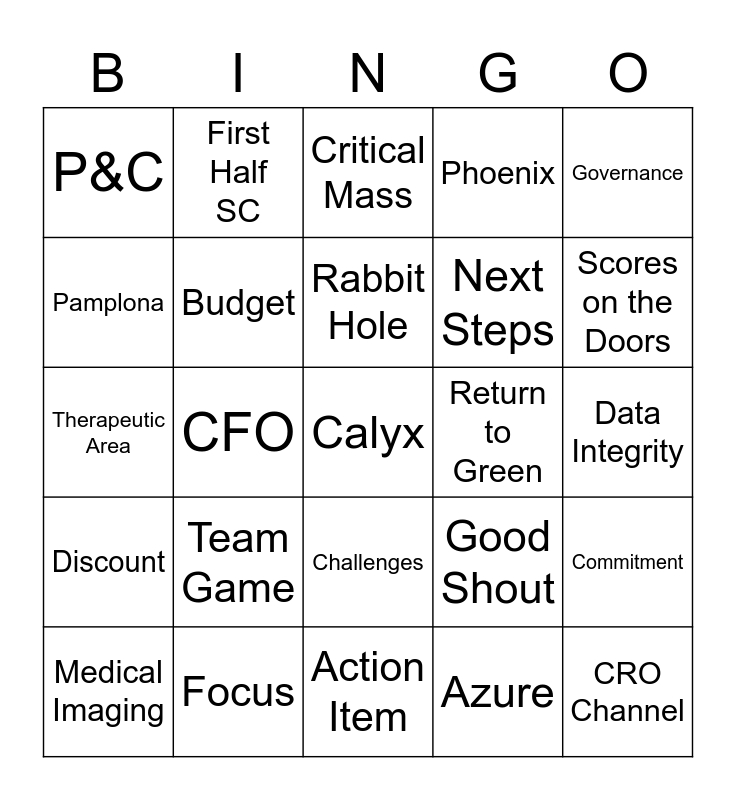 This bingo card has a free space and 44 words: Fair Point, CRO Channel, Strategy, Medical Imaging, IRT, Azure, Critical Mass, Backlog, Governance, Focus, Phoenix, Return to Green, Challenges, Team Game, Forecast, Action Item, Tech Services, Therapeutic Area, Devil’s Advocate, Scores on the Doors, First Half SC, Marketing Can Do That, Log/Raise a Ticket, P&C, CEO, Data Integrity, Tickety Boo, A Gnat’s Whisker, Good Shout, Discount, Patient(s), Commitment, DIA, Clean Data, CFO, Pipeline, SFDC, Target Operating Model, Rabbit Hole, Pamplona, Next Steps, RIM, Budget and Optics Pricing.