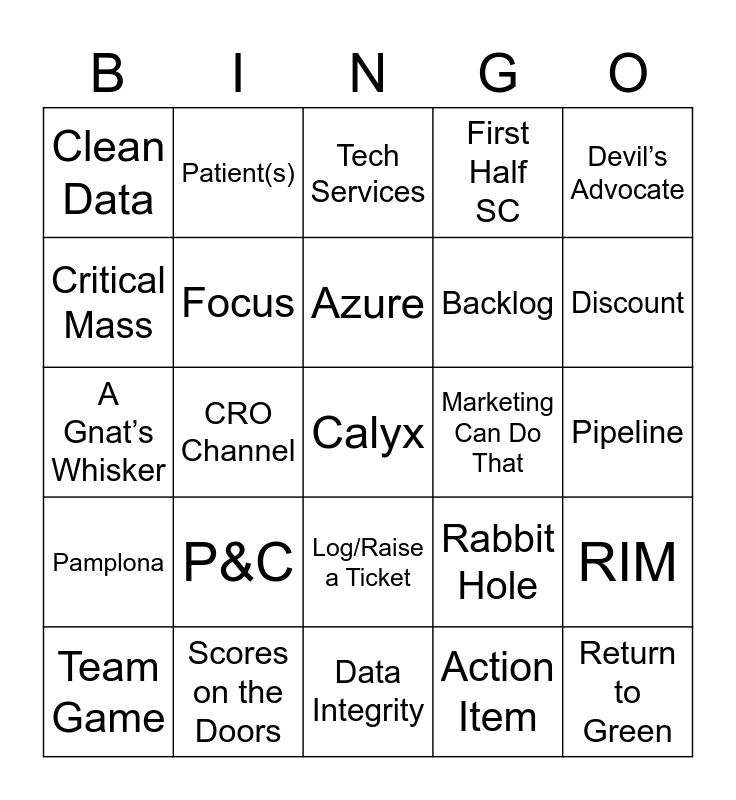 This bingo card has a free space and 44 words: Phoenix, Return to Green, Challenges, Team Game, Forecast, Action Item, Tech Services, Therapeutic Area, Devil’s Advocate, Scores on the Doors, First Half SC, Marketing Can Do That, Log/Raise a Ticket, P&C, CEO, Data Integrity, Tickety Boo, A Gnat’s Whisker, Good Shout, Discount, Patient(s), Commitment, DIA, Clean Data, CFO, Pipeline, SFDC, Target Operating Model, Rabbit Hole, Pamplona, Next Steps, RIM, Budget, Fair Point, CRO Channel, Strategy, Medical Imaging, IRT, Azure, Critical Mass, Backlog, Governance, Focus and Optics Pricing.