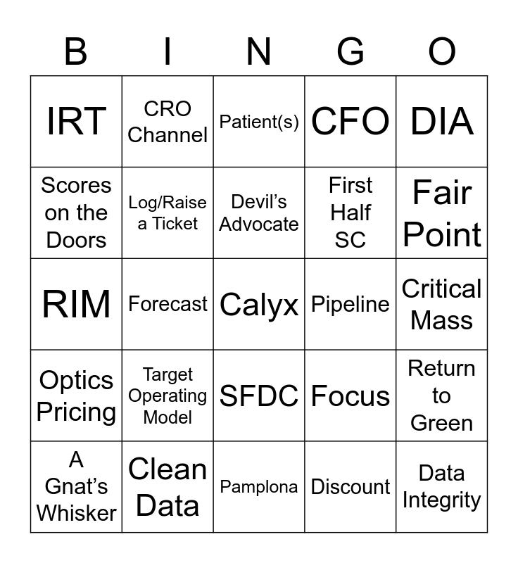 This bingo card has a free space and 44 words: CEO, Data Integrity, Tickety Boo, A Gnat’s Whisker, Good Shout, Discount, Patient(s), Commitment, DIA, Clean Data, CFO, Pipeline, SFDC, Target Operating Model, Rabbit Hole, Pamplona, Next Steps, RIM, Budget, Fair Point, CRO Channel, Strategy, Medical Imaging, IRT, Azure, Critical Mass, Backlog, Governance, Focus, Optics Pricing, Phoenix, Return to Green, Challenges, Team Game, Forecast, Action Item, Tech Services, Therapeutic Area, Devil’s Advocate, Scores on the Doors, First Half SC, Marketing Can Do That, Log/Raise a Ticket and P&C.