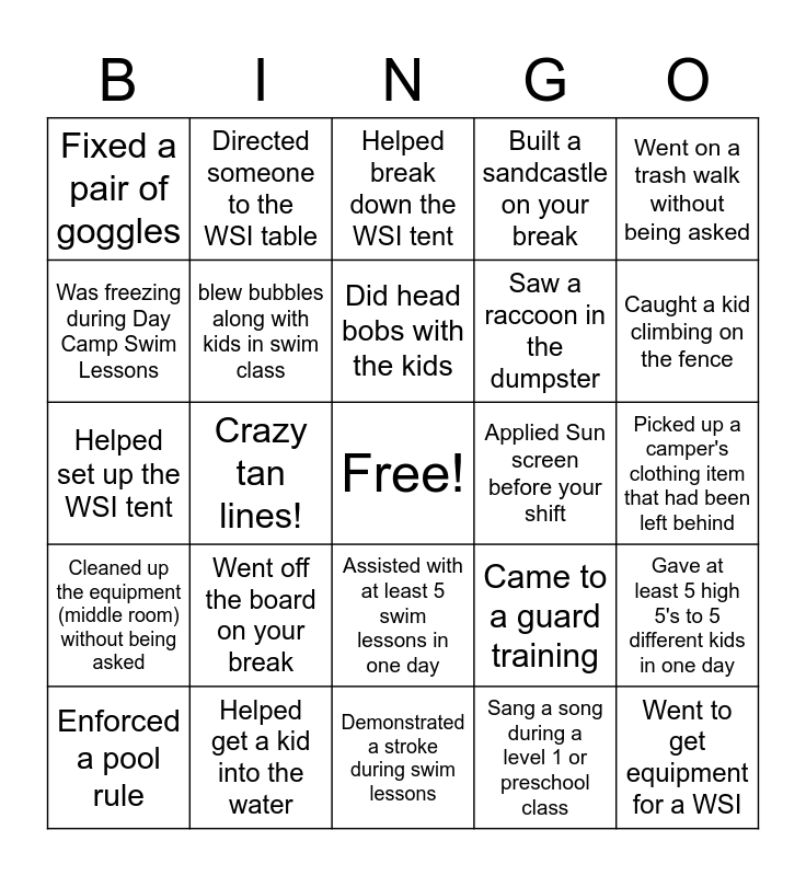 This bingo card has a free space and 24 words: Went off the board on your break, Helped get a kid into the water, Did head bobs with the kids, Enforced a pool rule, Went on a trash walk without being asked, Fixed a pair of goggles, Was freezing during Day Camp Swim Lessons, Directed someone to the WSI table, Applied Sun screen before your shift, Assisted with at least 5 swim lessons in one day, Saw a raccoon in the dumpster, Helped set up the WSI tent, Came to a guard training, Gave at least 5 high 5's to 5 different kids in one day, blew bubbles along with kids in swim class, Sang a song during a level 1 or preschool class, Picked up a camper's clothing item that had been left behind, Helped break down the WSI tent, Caught a kid climbing on the fence, Crazy tan lines!, Went to get equipment for a WSI, Cleaned up the equipment (middle room) without being asked, Built a sandcastle on your break and Demonstrated a stroke during swim lessons.