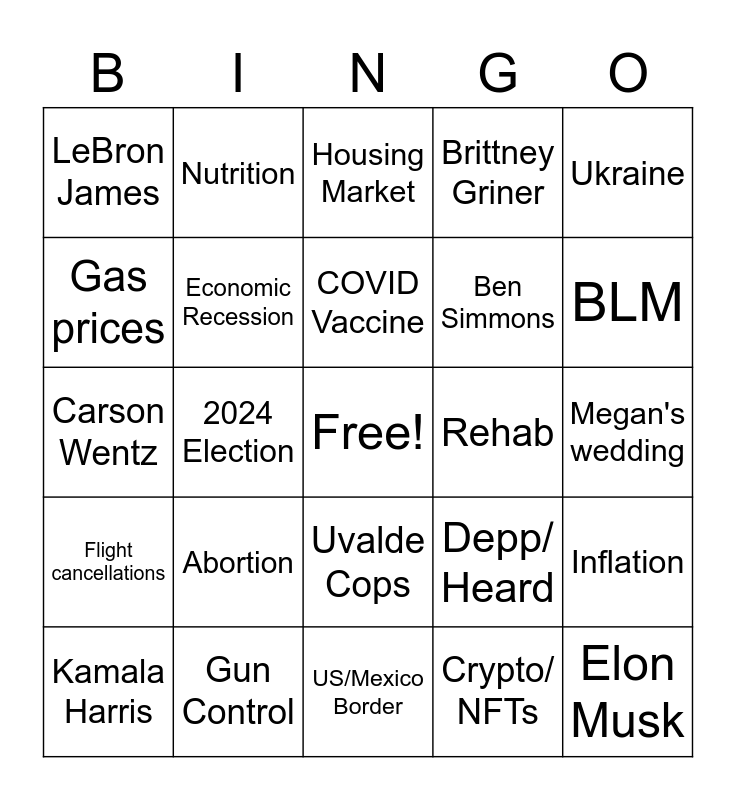 This bingo card has a free space and 24 words: Abortion, Gun Control, COVID Vaccine, Kamala Harris, Ukraine, LeBron James, Gas prices, Nutrition, Rehab, Uvalde Cops, Ben Simmons, Carson Wentz, Depp/ Heard, Inflation, Economic Recession, Crypto/ NFTs, Megan's wedding, Housing Market, BLM, 2024 Election, Elon Musk, Flight cancellations, Brittney Griner and US/Mexico Border.