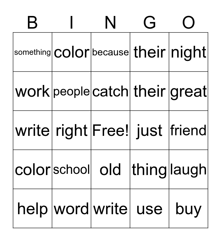 This bingo card has a free space and 24 words: school, word, catch, help, night, something, work, color, just, old, their, write, thing, laugh, people, use, friend, because, great, right, buy, color, their and write.