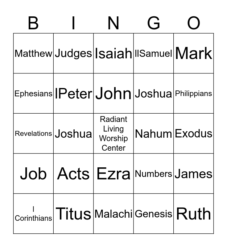 This bingo card has a free space and 24 words: Acts, Titus, John, l Corinthians, Mark, Matthew, Ephesians, Judges, Nahum, Ezra, Joshua, Revelations, Numbers, James, lPeter, Genesis, Exodus, Isaiah, Philippians, Joshua, Ruth, Job, llSamuel and Malachi.
