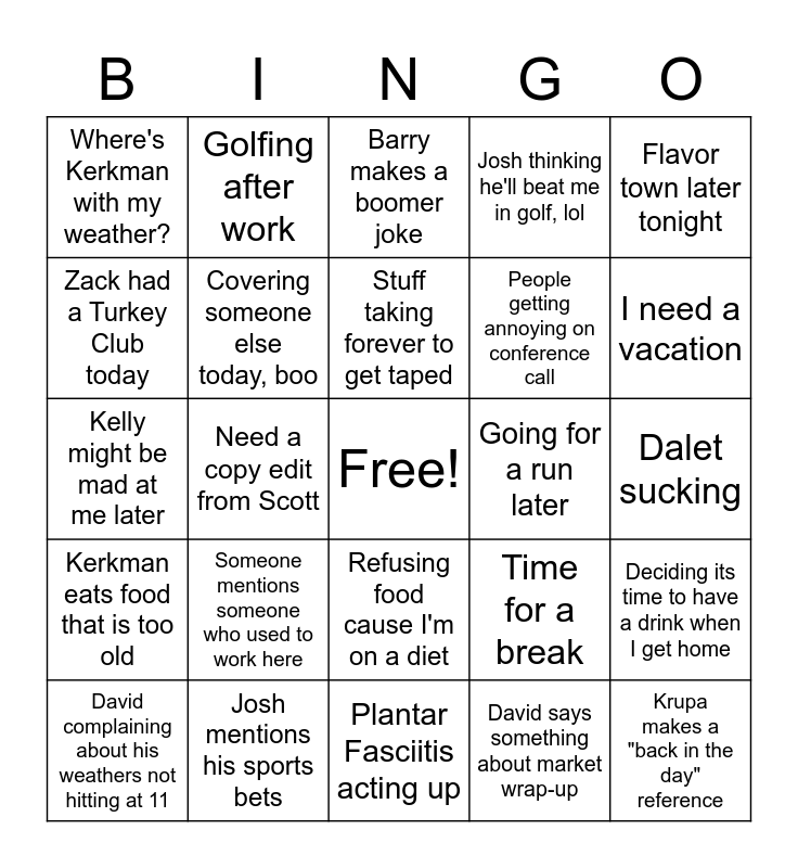 This bingo card has a free space and 24 words: Someone mentions someone who used to work here, Josh mentions his sports bets, Stuff taking forever to get taped, David complaining about his weathers not hitting at 11, Flavor town later tonight, Where's Kerkman with my weather?, Zack had a Turkey Club today, Golfing after work, Going for a run later, Refusing food cause I'm on a diet, People getting annoying on conference call, Kelly might be mad at me later, Time for a break, Deciding its time to have a drink when I get home, Covering someone else today, boo, David says something about market wrap-up, Dalet sucking, Barry makes a boomer joke, I need a vacation, Need a copy edit from Scott, Krupa makes a "back in the day" reference, Kerkman eats food that is too old, Josh thinking he'll beat me in golf, lol and Plantar Fasciitis acting up.