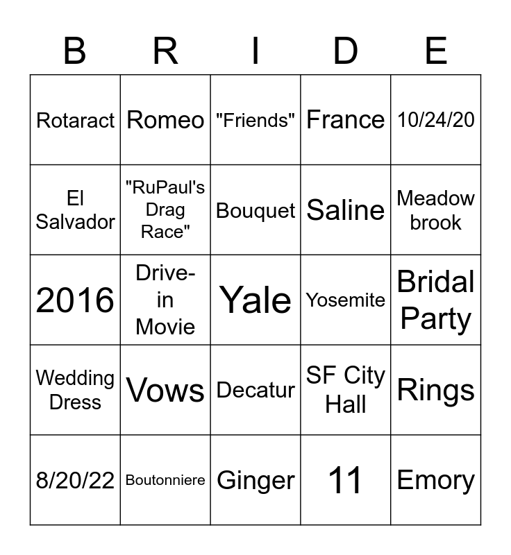 This bingo card has 31 words: Ginger, Dahl, Drive-in Movie, U of M, Rotaract, "Friends", "RuPaul's Drag Race", SF City Hall, Yosemite, 11, Bridal Party, Yale, Emory, WHO, Meadow brook, Happiness, Rings, Vows, Wedding Dress, Decatur, 10/24/20, 8/24/21, 8/20/22, Romeo, Saline, El Salvador, France, 2016, Boutonniere, Bouquet and Jr. Wedding Party.