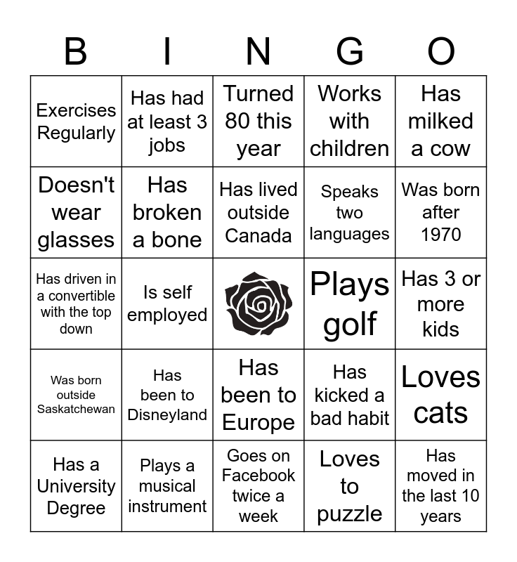 This bingo card has a free space and 24 words: Has been to Disneyland, Plays a musical instrument, Has lived outside Canada, Has a University Degree, Has milked a cow, Exercises Regularly, Doesn't wear glasses, Has had at least 3 jobs, Plays golf, Has been to Europe, Speaks two languages, Has driven in a convertible with the top down, Has kicked a bad habit, Loves cats, Has broken a bone, Loves to puzzle, Has 3 or more kids, Turned 80 this year, Was born after 1970, Is self employed, Has moved in the last 10 years, Was born outside Saskatchewan, Works with children and Goes on Facebook twice a week.