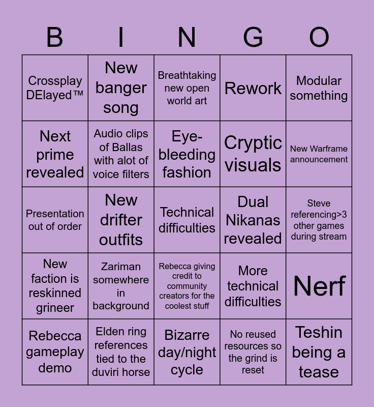 This bingo card has a free space and 29 words: Rebecca gameplay demo, All new weapons have an aoe mode, New drifter outfits, Operator melee never coming, Crossplay DElayed™, Breathtaking new open world art, Audio clips of Ballas with alot of voice filters, Zariman somewhere in background, Dual Nikanas revealed, Elden ring references tied to the duviri horse, Steve referencing>3 other games during stream, Teshin being a tease, Bizarre day/night cycle, No reused resources so the grind is reset, New Warframe announcement, Cinematics, Rebecca giving credit to community creators for the coolest stuff, New faction is reskinned grineer, Modular something, Presentation out of order, More technical difficulties, New faction teaser, Cryptic visuals, Next prime revealed, Rework, New banger song, Nerf, Eye-bleeding fashion and Crossplay date!?(unlikely).