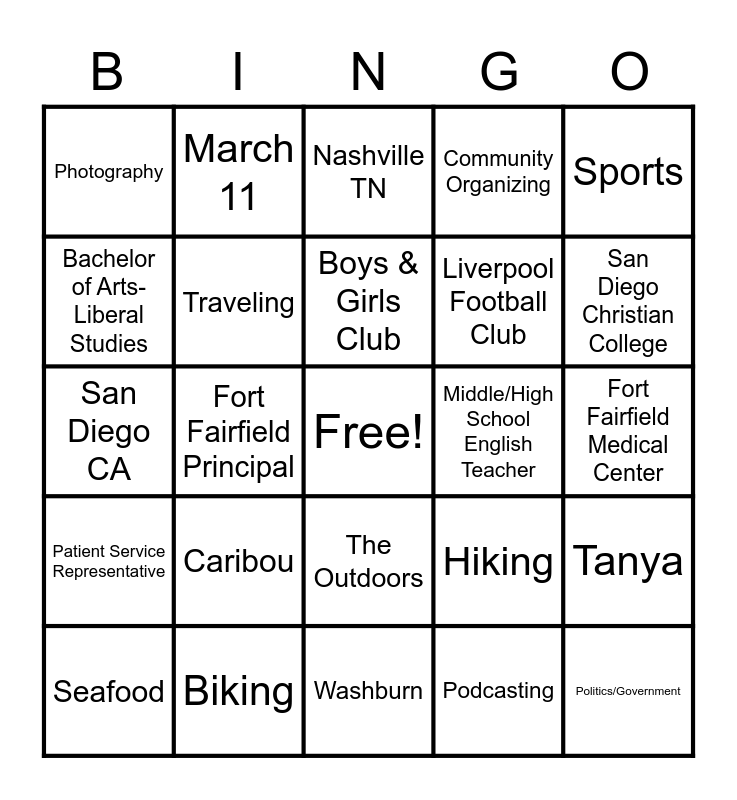 This bingo card has a free space and 24 words: Caribou, Biking, Boys & Girls Club, Seafood, Sports, Photography, Bachelor of Arts-Liberal Studies, March 11, Middle/High School English Teacher, The Outdoors, Liverpool Football Club, San Diego CA, Hiking, Tanya, Traveling, Podcasting, Fort Fairfield Medical Center, Nashville TN, San Diego Christian College, Fort Fairfield Principal, Politics/Government, Patient Service Representative, Community Organizing and Washburn.