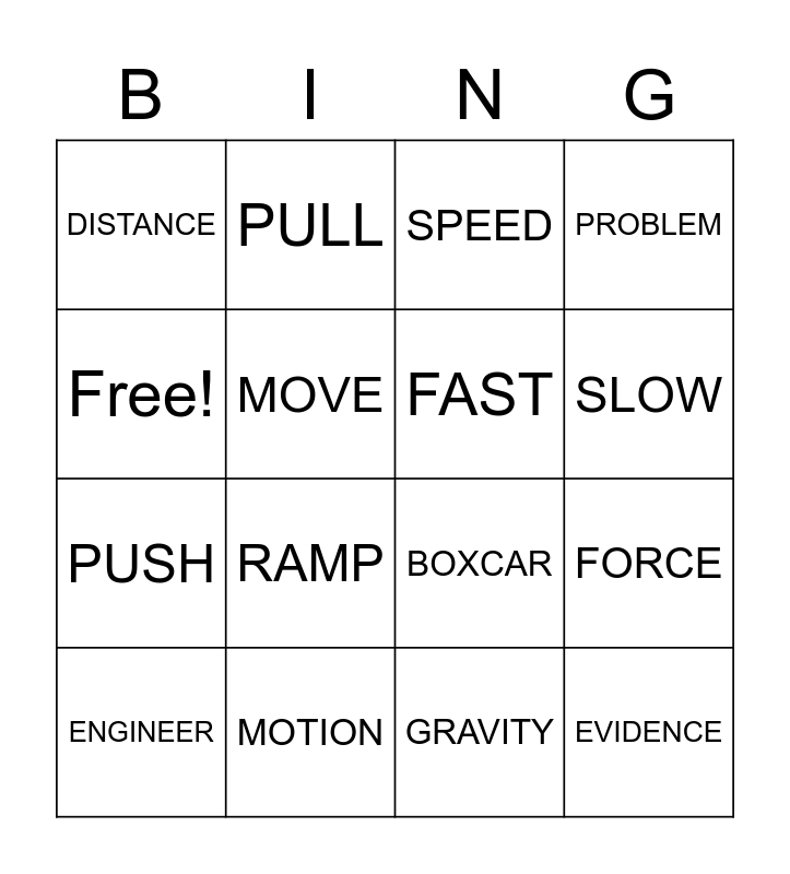 This bingo card has 16 words: MOTION, FORCE, SPEED, DISTANCE, PUSH, PULL, BOXCAR, GRAVITY, Free!, MOVE, ENGINEER, PROBLEM, RAMP, SLOW, FAST and EVIDENCE.