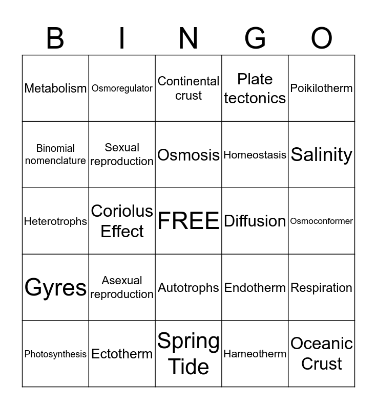 This bingo card has a free space and 24 words: Asexual reproduction, Ectotherm, Osmosis, Photosynthesis, Poikilotherm, Metabolism, Binomial nomenclature, Osmoregulator, Diffusion, Autotrophs, Homeostasis, Heterotrophs, Endotherm, Respiration, Sexual reproduction, Hameotherm, Osmoconformer, Continental crust, Salinity, Coriolus Effect, Oceanic Crust, Gyres, Plate tectonics and Spring Tide.