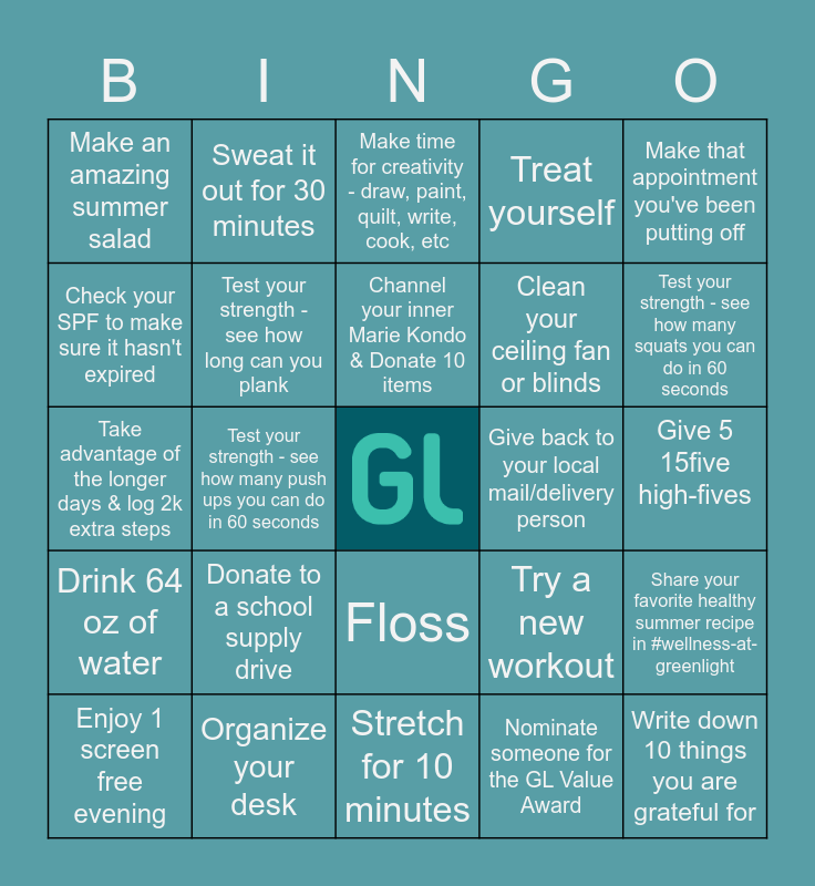 This bingo card has a free space and 24 words: Donate to a school supply drive, Organize your desk, Channel your inner Marie Kondo & Donate 10 items, Enjoy 1 screen free evening, Make that appointment you've been putting off, Make an amazing summer salad, Check your SPF to make sure it hasn't expired, Sweat it out for 30 minutes, Give back to your local mail/delivery person, Floss, Clean your ceiling fan or blinds, Take advantage of the longer days & log 2k extra steps, Try a new workout, Share your favorite healthy summer recipe in #wellness-at-greenlight, Test your strength - see how long can you plank, Nominate someone for the GL Value Award, Give 5 15five high-fives, Make time for creativity - draw, paint, quilt, write, cook, etc, Test your strength - see how many squats you can do in 60 seconds, Test your strength - see how many push ups you can do in 60 seconds, Write down 10 things you are grateful for, Drink 64 oz of water, Treat yourself and Stretch for 10 minutes.