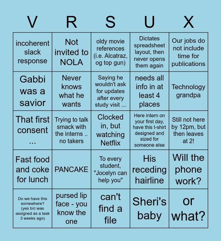 This bingo card has a free space and 24 words: Do we have this somewhere? (yes b/c was assigned as a task 3 weeks ago), PANCAKE, Saying he wouldn't ask for updates after every study visit ..., Sheri's baby, Our jobs do not include time for publications, incoherent slack response, Not invited to NOLA, oldy movie references (i.e. Alcatraz, og top gun), Here intern on your first day, have this t-shirt designed and sized for someone else, Still not here by 12pm, but then leaves at 2!, That first consent ..., Never knows what he wants, His receding hairline, Will the phone work?, Gabbi was a savior, pursed lip face - you know the one, can't find a file, Dictates spreadsheet layout, then never opens them again, Technology grandpa, Fast food and coke for lunch, Trying to talk smack with the interns .. no takers, To every student, "Jocelyn can help you", needs all info in at least 4 places and or what?.