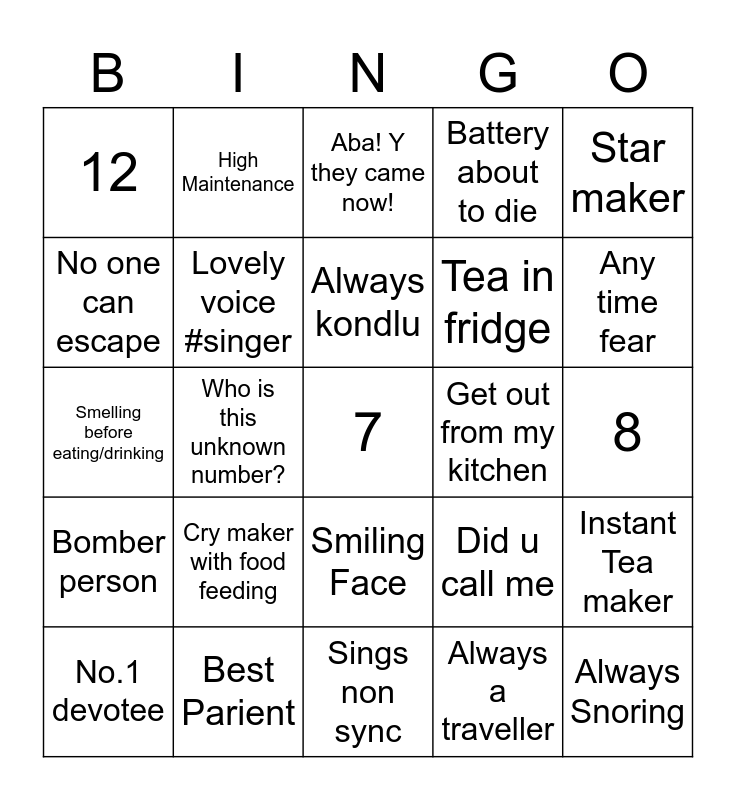 This bingo card has a free space and 29 words: Will get u Tea in 2 mins, Best Parient, Aba! Y they came now!, 6, Star maker, 12, Lovely voice #singer, Always kondlu, Get out from my kitchen, Instant Tea maker, No.1 devotee, Who is this unknown number?, Always a traveller, Always Snoring, Smelling before eating/drinking, 1, Sings non sync, Did u call me, Any time fear, Bomber person, Cry maker with food feeding, 3, Tea in fridge, 8, No one can escape, High Maintenance, Smiling Face, Battery about to die and Full charge.