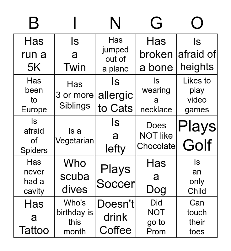 This bingo card has 25 words: Who scuba dives, Doesn't drink Coffee, Is allergic to Cats, Has a Tattoo, Is afraid of heights, Has run a 5K, Has been to Europe, Is a Twin, Does NOT like Chocolate, Plays Soccer, Is wearing a necklace, Is afraid of Spiders, Has a Dog, Is an only Child, Has 3 or more Siblings, Can touch their toes, Plays Golf, Has jumped out of a plane, Likes to play video games, Is a Vegetarian, Is a lefty, Who's birthday is this month, Has never had a cavity, Has broken a bone and Did NOT go to Prom.