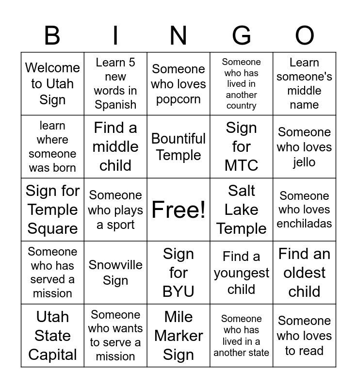 This bingo card has a free space and 25 words: Snowville Sign, Mile Marker Sign, Bountiful Temple, Utah State Capital, Learn someone's middle name, Welcome to Utah Sign, learn where someone was born, Learn 5 new words in Spanish, Salt Lake Temple, Sign for BYU, Sign for MTC, Sign for Temple Square, Find a youngest child, Find an oldest child, Find a middle child, Someone who loves pizza, Someone who loves enchiladas, Someone who loves popcorn, Someone who loves jello, Someone who plays a sport, Someone who loves to read, Someone who wants to serve a mission, Someone who has served a mission, Someone who has lived in another country and Someone who has lived in a another state.