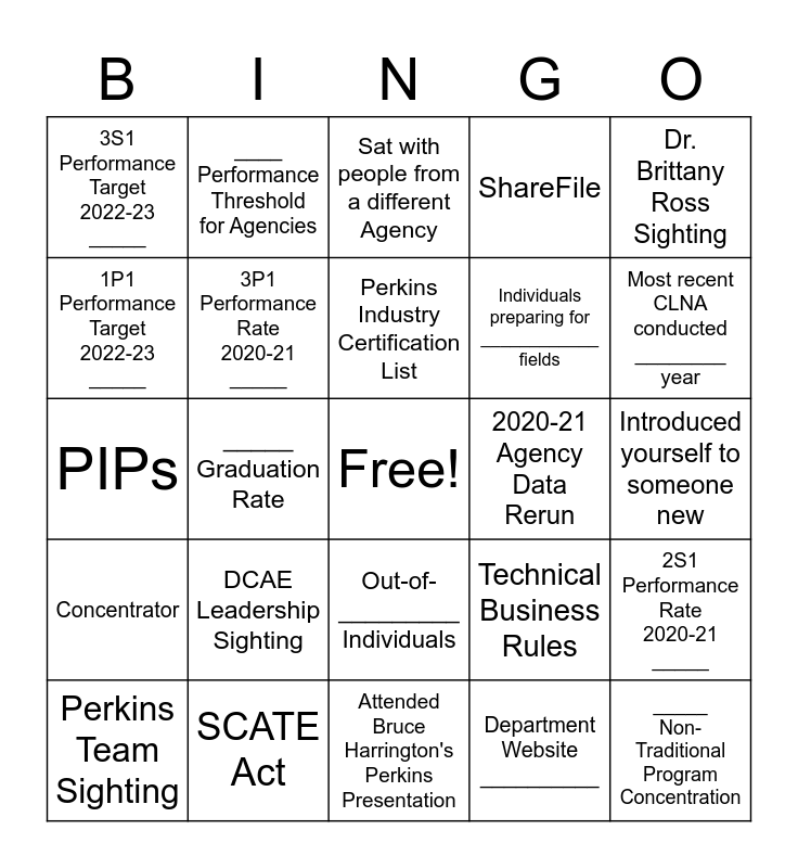 This bingo card has a free space and 24 words: DCAE Leadership Sighting, SCATE Act, Perkins Industry Certification List, Perkins Team Sighting, Dr. Brittany Ross Sighting, 3S1 Performance Target 2022-23 _____, 1P1 Performance Target 2022-23 _____, ____ Performance Threshold for Agencies, 2020-21 Agency Data Rerun, Out-of- _________ Individuals, Individuals preparing for ____________ fields, PIPs, Technical Business Rules, 2S1 Performance Rate 2020-21 _____, 3P1 Performance Rate 2020-21 _____, Department Website __________, Introduced yourself to someone new, Sat with people from a different Agency, Most recent CLNA conducted ________ year, _____ Graduation Rate, _____ Non-Traditional Program Concentration, Concentrator, ShareFile and Attended Bruce Harrington's Perkins Presentation.