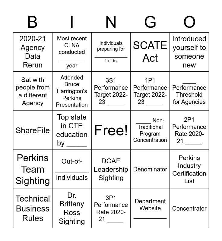 This bingo card has a free space and 29 words: Technical Business Rules, 2S1 Performance Rate 2020-21 _____, 3P1 Performance Rate 2020-21 _____, Department Website __________, Introduced yourself to someone new, Sat with people from a different Agency, Most recent CLNA conducted ________ year, _____ Graduation Rate, _____ Non-Traditional Program Concentration, Concentrator, ShareFile, Attended Bruce Harrington's Perkins Presentation, Numerator, Denominator, 2P1 Performance Rate 2020-21 _____, 5S1 Performance Target 2022-23 _____, Top state in CTE education by _____, DCAE Leadership Sighting, SCATE Act, Perkins Industry Certification List, Perkins Team Sighting, Dr. Brittany Ross Sighting, 3S1 Performance Target 2022-23 _____, 1P1 Performance Target 2022-23 _____, ____ Performance Threshold for Agencies, 2020-21 Agency Data Rerun, Out-of- _________ Individuals, Individuals preparing for ____________ fields and PIPs.