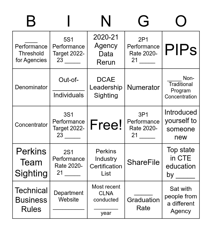 This bingo card has a free space and 29 words: Technical Business Rules, Dr. Brittany Ross Sighting, 3S1 Performance Target 2022-23 _____, 1P1 Performance Target 2022-23 _____, ____ Performance Threshold for Agencies, 2020-21 Agency Data Rerun, Out-of- _________ Individuals, 2S1 Performance Rate 2020-21 _____, 3P1 Performance Rate 2020-21 _____, Department Website __________, Introduced yourself to someone new, Sat with people from a different Agency, Most recent CLNA conducted ________ year, _____ Graduation Rate, _____ Non-Traditional Program Concentration, Individuals preparing for ____________ fields, Perkins Industry Certification List, Perkins Team Sighting, PIPs, Concentrator, ShareFile, Attended Bruce Harrington's Perkins Presentation, Numerator, Denominator, 2P1 Performance Rate 2020-21 _____, 5S1 Performance Target 2022-23 _____, Top state in CTE education by _____, DCAE Leadership Sighting and SCATE Act.
