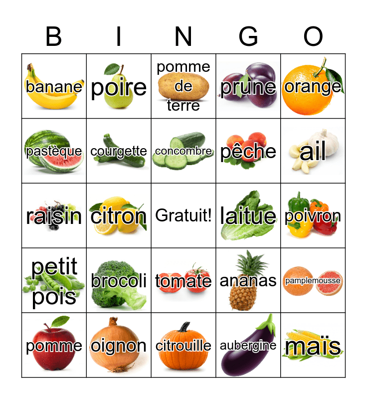 This bingo card has 24 images, a free space and 24 words: pomme, brocoli, concombre, aubergine, orange, banane, poire, pomme de terre, laitue, poivron, raisin, courgette, ananas, pamplemousse, pastèque, oignon, citrouille, prune, ail, petit pois, citron, tomate, pêche and maïs.